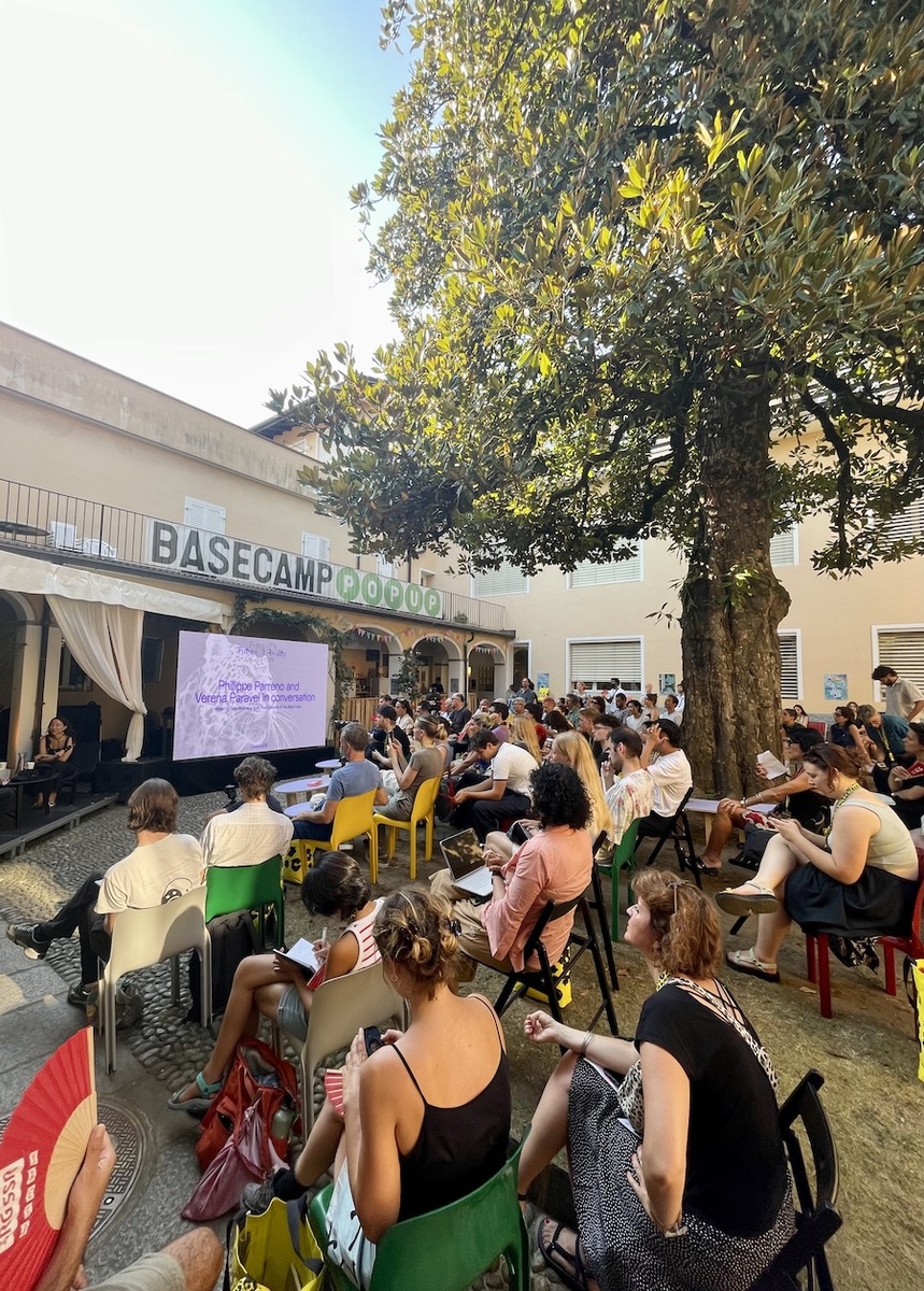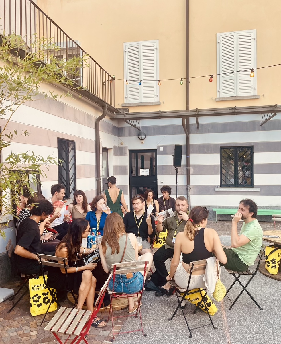 Après cinq éditions au Teatro Paravento, le Réseau Cinéma CH a élu domicile à l’académie de jeunes artistes BaseCamp pour son apéritif locarnais annuel. C’est ainsi que le lundi 11 août dernier, étudiant·e·s, jeunes cinéastes, chercheuses et chercheurs, festivalières et festivaliers, et les représentant·e·s des institutions du Réseau (UNIL, UZH, USI, ECAL, HEAD, ZHdK, Cinémathèque suisse) se sont réunis dès 18h sur la place du BaseCamp pour converser autour d’un verre, participer à des débats et se restaurer. Cette soirée aura vu notamment l’intervention de Stefano Knuchel, fondateur de BaseCamp, et de Daniel J. Wiegand, Président du Réseau Cinéma CH.